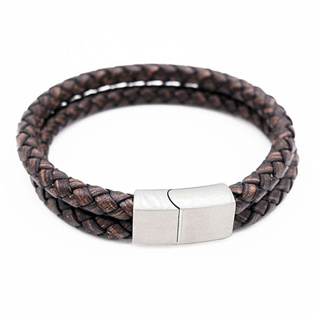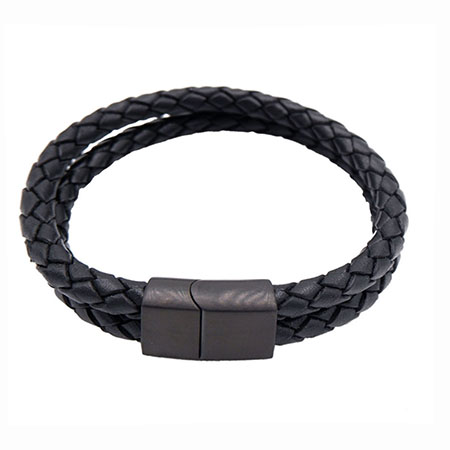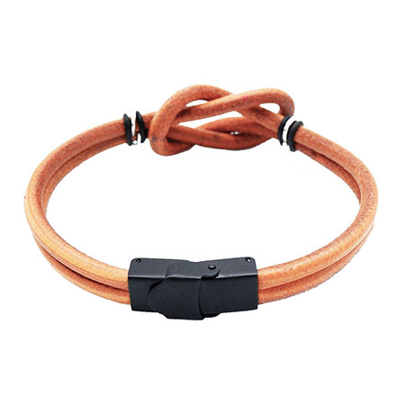 Double strand round leather bracelet with brushed stainless steel clasp in black